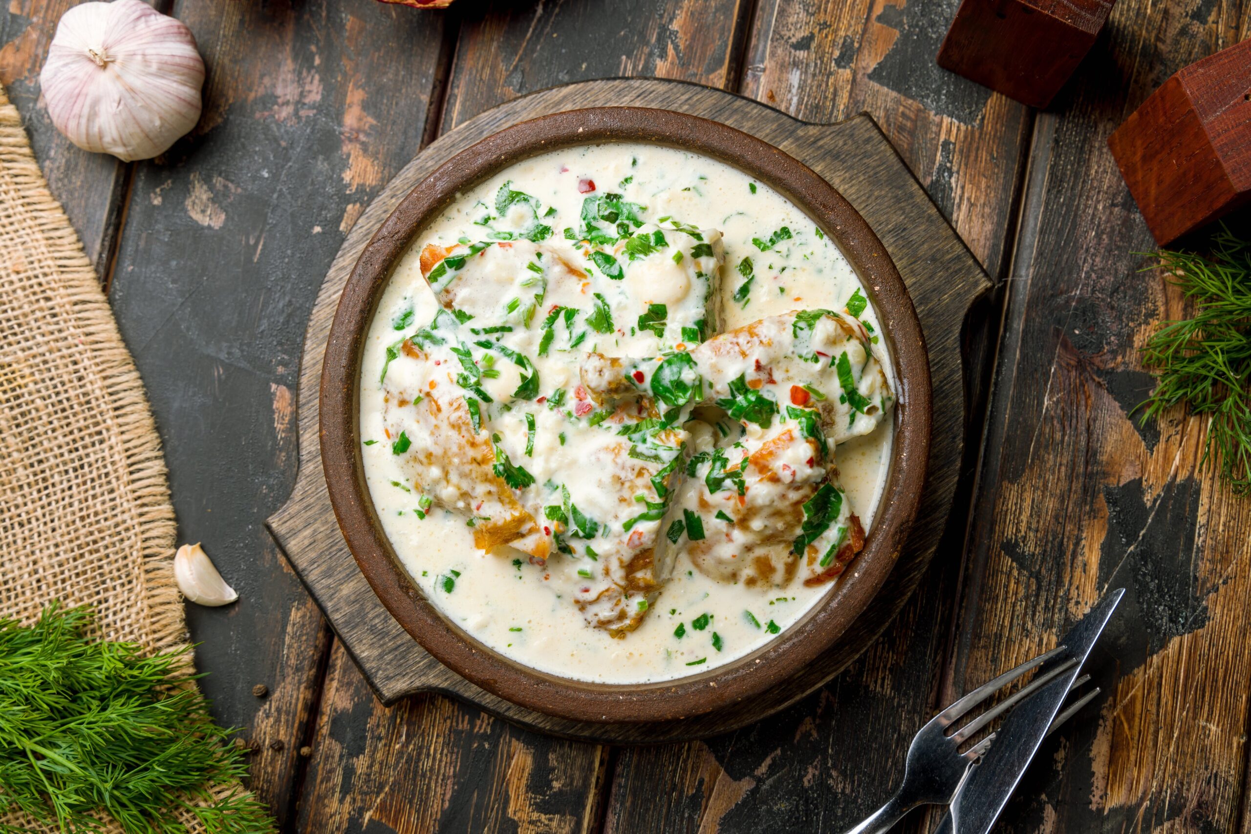 Užburkite skonių receptorius gardžiais skoniais bei aromatais: vištiena kreminiame česnakų padaže nustebins net ir visko ragavusius.
